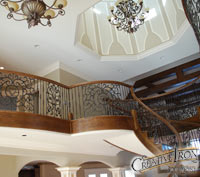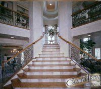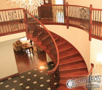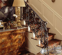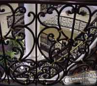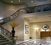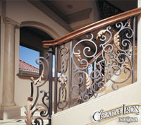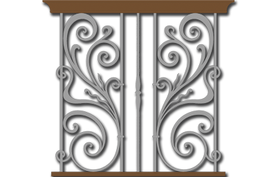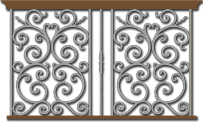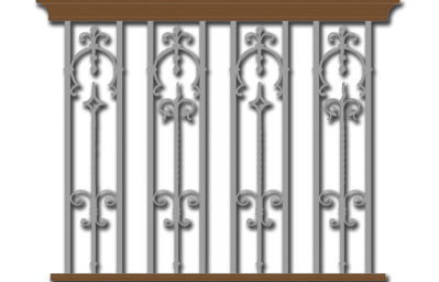 When detail is desired, these panels definitely deliver. Highly detailed medallions, dimension changes in the iron work, and different sized metal legs all add to the well thought out nature of this collection. These panels look best when used in the pattern to the right. The center "deco" panel breaks up the heavy legs of these panels and allows for more detail to be added. Like all iron panels, these are stocked in raw steel and coated to you specs in house. Custom bending can also be accommodated to fit curved staircases.