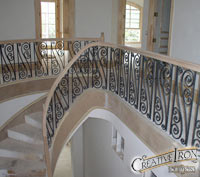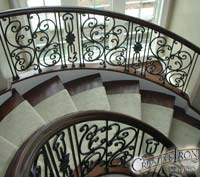 Beautiful, multidimensional scroll work, fades from round bar to flat, giving these panels a true hand worked feel. 5/8 inch round bar provides the structural legs. These panels look good in pairs as well as separated with single or multiple balusters. Like all iron panels, these are stocked in raw steel and coated to you specs in house. Custom bending can also be accommodated to fit curved staircases.